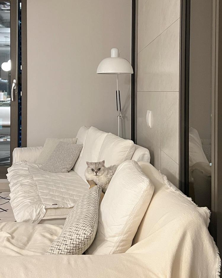 화이트 소파로 밝고 환해보이는 거실!🤍🤍 다른 가구나 소품과의 조화가 쉬워서 넘 좋아요~
