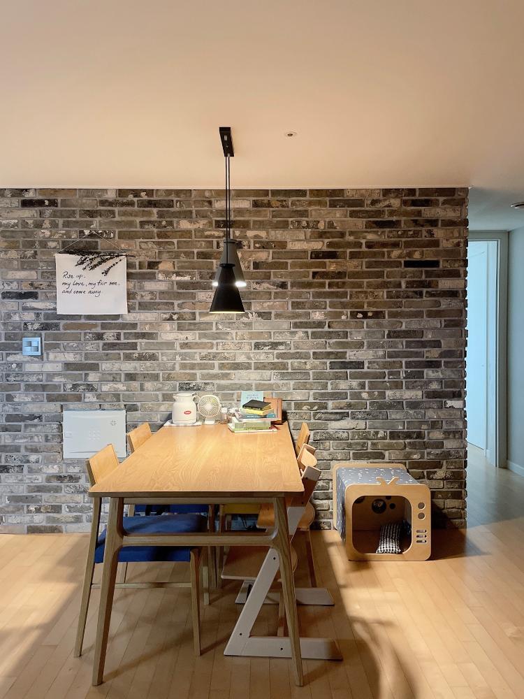 멍멍이 집이 원목이라 원목 식탁과 참 잘 어울려요 :)