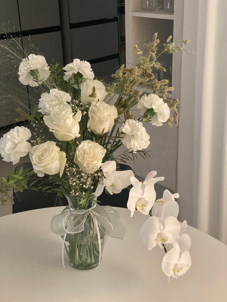지난 주말 결혼식에서 얻어온 꽃으로 꾸민 식탁🤍